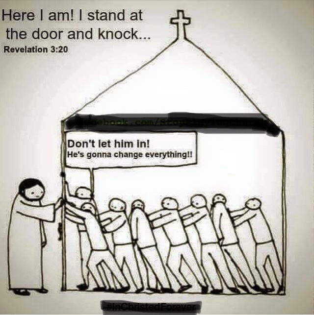 So which picture was more accurate to Scripture or to where you are at with regards to your relationship with Jesus? The one with a nice clean door and a warm glow of self righteousness from within? Or the one with overgrown weeds blocking the doorway with Christ outside knocking, with a light in his hand waiting patiently to be invited in.